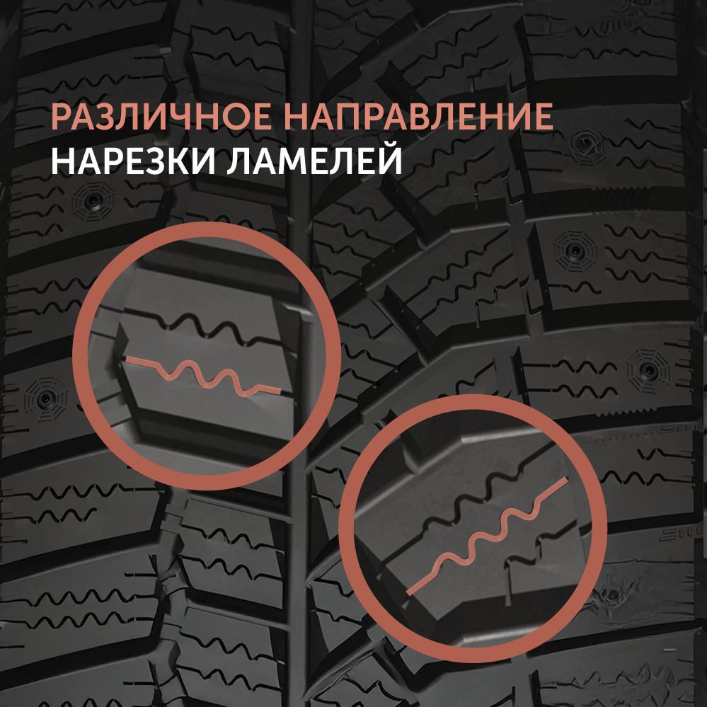 Разное направление ламелей на блоках протектора улучшает продольное и боковое сцепление, обеспечивая уверенное и предсказуемое поведение автомобиля на поворотах и маневрировании.