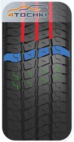 Высокая курсовая устойчивость и управляемость достигнута за счет применения в конструкции протектора трех продольных канавок. Глубина, ширина и форма канавок была оптимизирована с помощью уникальной программы компьютерного моделирования 3D Mod.