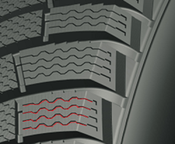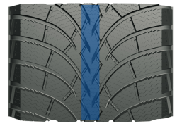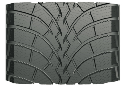 - Разнонаправленные зигзагообразные самоблокирующиеся 3D-ламели увеличивают жесткость протектора, предотвращая неравномерный износ, а также эффективно сводят снег и воду.