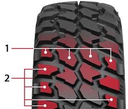 - Блоки плечевой зоны протектора разной геометрической формы с боковыми грунтозацепами способствуют надежному сцеплению шины в условиях движения по мокрой грязи и глубокому снегу.