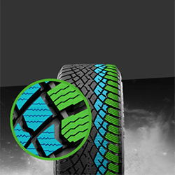 Инновационная система разнонаправленных 3D-ламелей IceBlock сочетает перпендикулярные и диагональные элементы, распределяя нагрузку в зависимости от типа манёвра. Это обеспечивает равномерное давление в пятне контакта, снижая деформацию блоков протектора и повышая точность управления