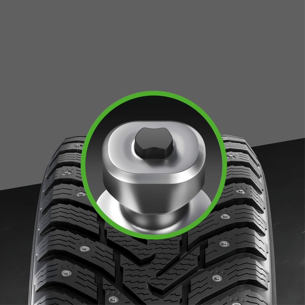 Специальная форма фланцев надежно удерживает шип в протекторе, равномерно распределяя нагрузку при контакте с дорогой. Благодаря такой конструкции снижается риск выпадения шипов и повышается износостойкость шины.