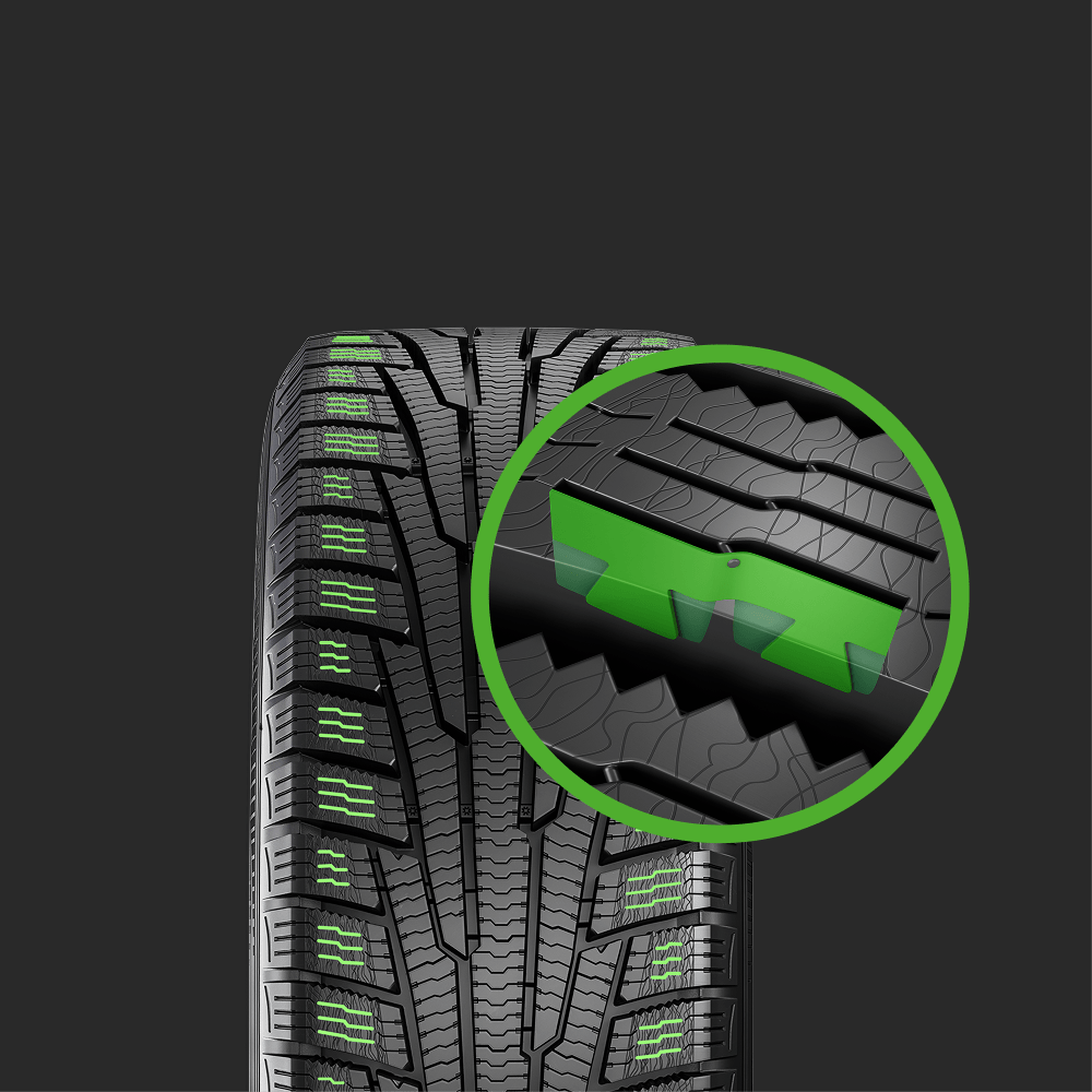 Специальные ламели-насосы в блоках протектора эффективно отводят влагу из пятна контакта. Во время движения они собирают воду и мгновенно выталкивают ее наружу. Такая конструкция обеспечивает более надежное сцепление на мокрой и обледенелой поверхности.