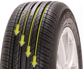 Уникальный рисунок протектора с четырьмя продольными каналами обеспечивают покрышке эффективное противостояние аквапланированию. Непрерывное центральное ребро предотвращает неравномерный износ и обеспечивает превосходную курсовую устойчивость на высоких скоростях. Оптимизированный рисунок протектора с блоками расположенными с переменным шагом гарантируют стабильное поведение шины при маневрировании, низкий уровень шума и быстрый отклик на поворот руля.
