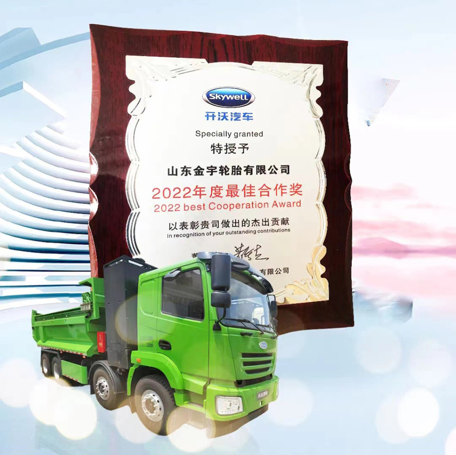Китайская автомобилестроительная компания Kaiwo New Energy Automobile Group, специализирующаяся на производстве коммерческих автомобилей на новых источниках энергии, отметила своей корпоративной премией Best Cooperation Award 2022 шинную компанию Jinyu Tire за отличные характеристики поставляемых шин для заводской комплектации новых большегрузных электрических грузовиков и высокий уровень предоставляемого сервиса.