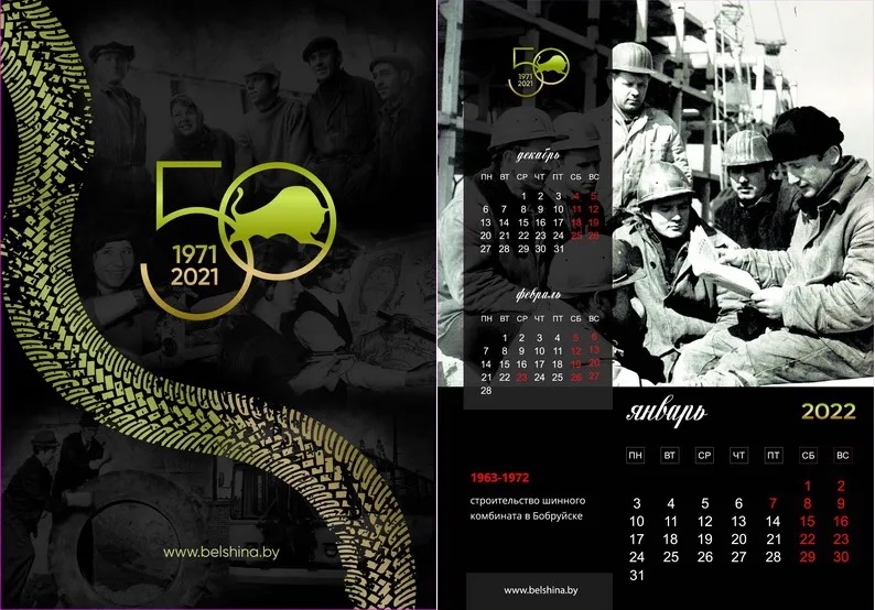 Компания «Белшина» представила новый корпоративный календарь на 2022 год. В основу издания, посвященного 50-летию выпуска первой белорусской шины, легли архивные фотографии.