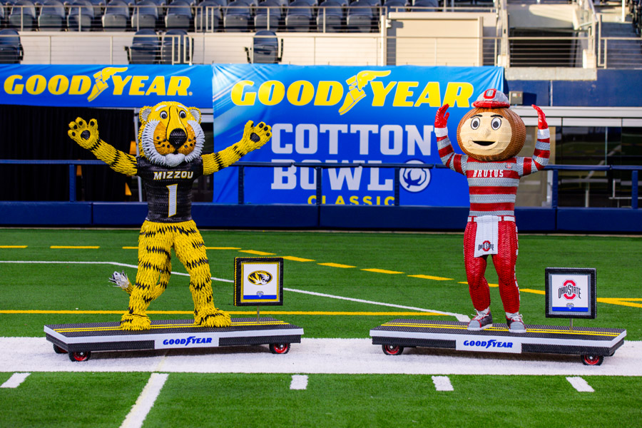 Компания Goodyear Tire & Rubber, являющаяся титульным спонсором ежегодного постсезонного матча по американскому футболу между сильнейшими студенческими командами Америки, представила две скульптуры талисманов команд-участниц 88-го матча Goodyear Cotton Bowl Classic, изготовленные из шин. Скульптуры, созданные вручную художником и бывшим бейсболистом Блейком МакФарландом, символизируют долгий путь и выдающиеся результаты университетских команд из Огайо и Миссури на пути к Goodyear Cotton Bowl Classic.