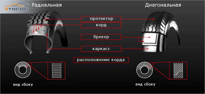 Кроме того, стоит обращать особое внимание на конструкцию каркаса шины. Смешанная установка на автомобиль шин радиальной и диагональной конструкции запрещена, так как это ухудшает тормозную эффективность, тяговые свойства и управляемость автомобиля. Несмотря на то, что большинство производителей уже давно переориентировали свое производство на изготовление шин радиальной конструкции, на рынке до сих пор доступны шины диагональной конструкции в определенных размерах.