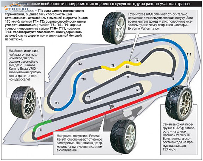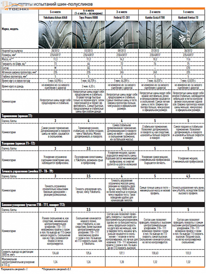 Что касается результатов теста, то опытным гонщикам-любителям мы советуем иметь два комплекта – Hankook Ventus TD для сухой погоды и Toyo Proxes R888 для сырой. Начинающим – Yokohama Advan A048 или Federal FZ-201: они заранее начинают сигнализировать о предстоящем срыве оси. Лучшее время на них не показать, но вероятность вылета будет ниже. Экспериментаторам могут приглянуться Kumho Eсsta V700.