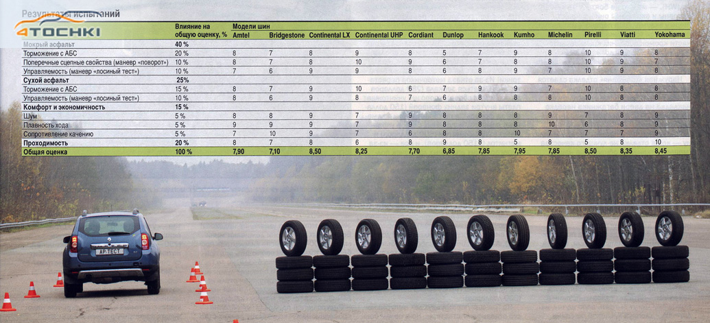 Не обошлось и без корейских производителей, представленных шинами Hankook DynaPro HP и Kumho Solus KH17. Честь отечественного шиностроения защищали модели Viatti Bosco A/T, Amtel Cruise 4X4 и Cordiant All-Terrain. Двенадцатым комплектом волею судеб оказался