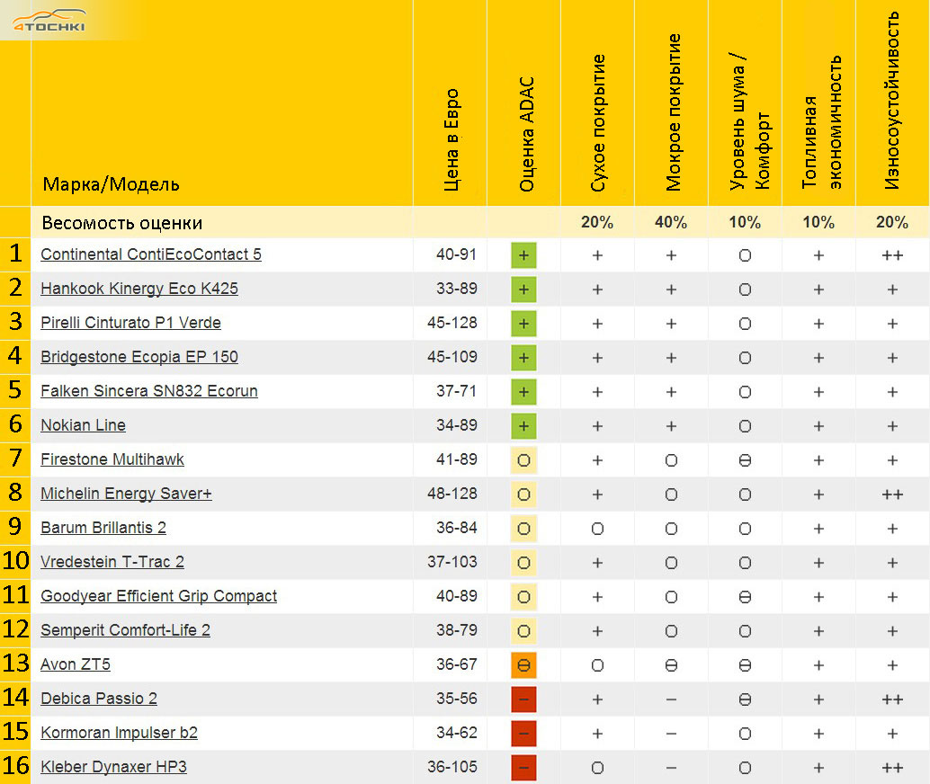Pirelli Cinturato P1 Verde, Bridgestone Ecopia EP 150, Falken SN832 Sinera Ecorun и Nokian Line с хорошим балансом характеристик без явных недостатков.