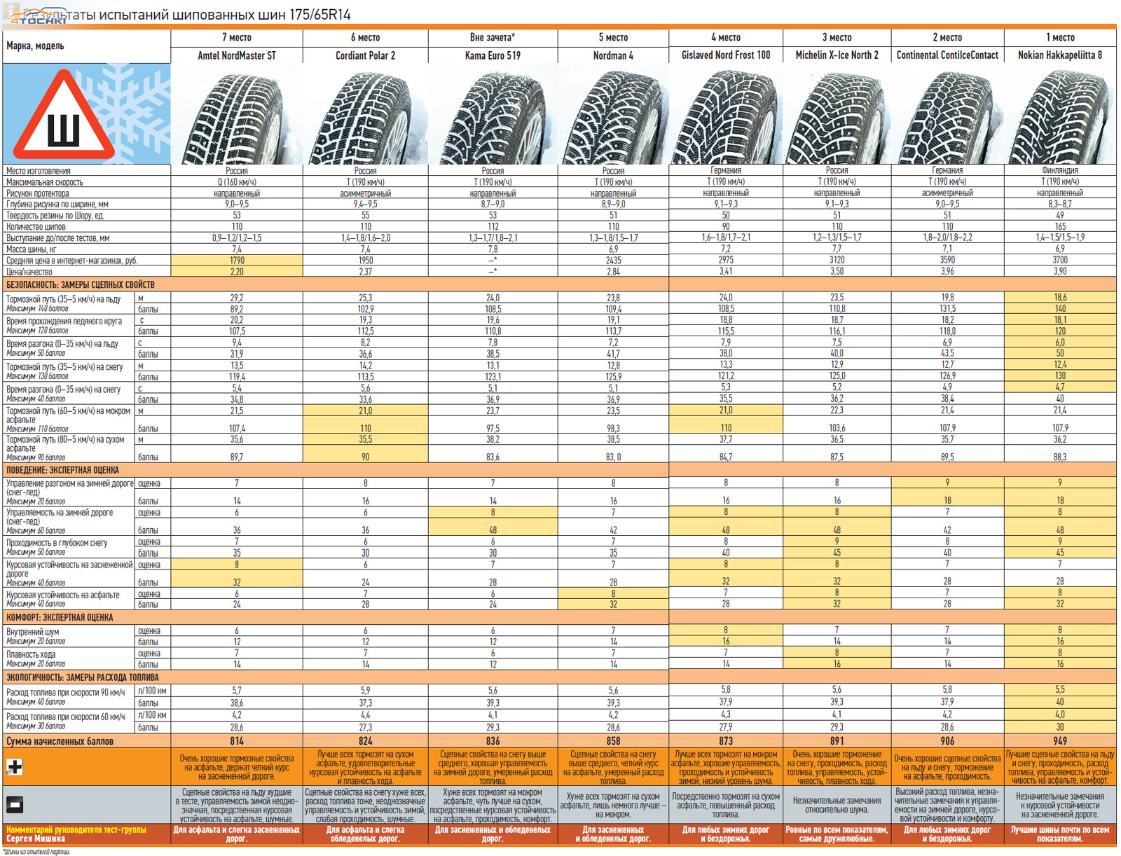 В очередном тесте зимних шин журнала «За Рулем» Сергей Мишин вместе со своими соратниками протестировал 8 комплектов шипованных и столько же фрикционных комплектов шин без шипов в популярном типоразмере 175/65R14. Все шины тестировались на автомобиле Lada Priora.