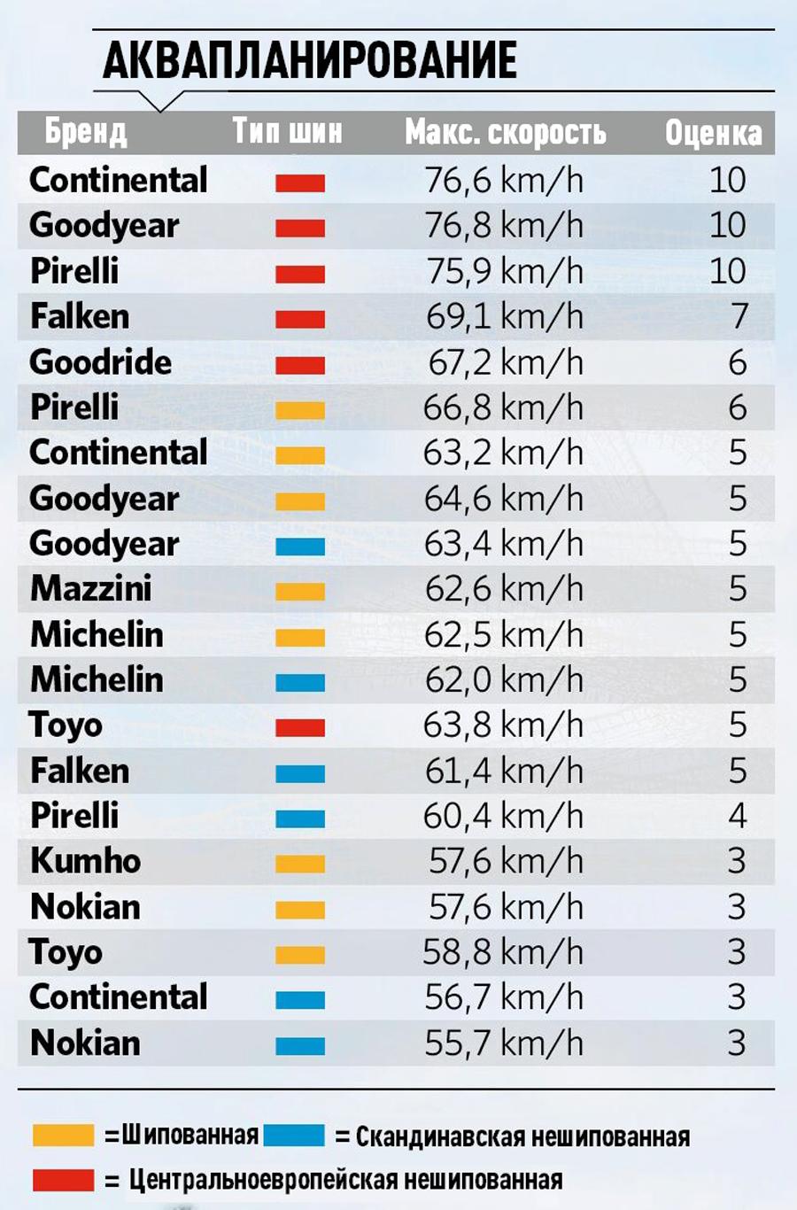 Разброс между шинами, точнее между типами шин, становится несколько иным в тестах на аквапланирование. Конечно, сразу понятно, что центральноевропейские шины занимают места вверху таблицы, за исключением Toyo, которая вообще не показывает того, что должна.