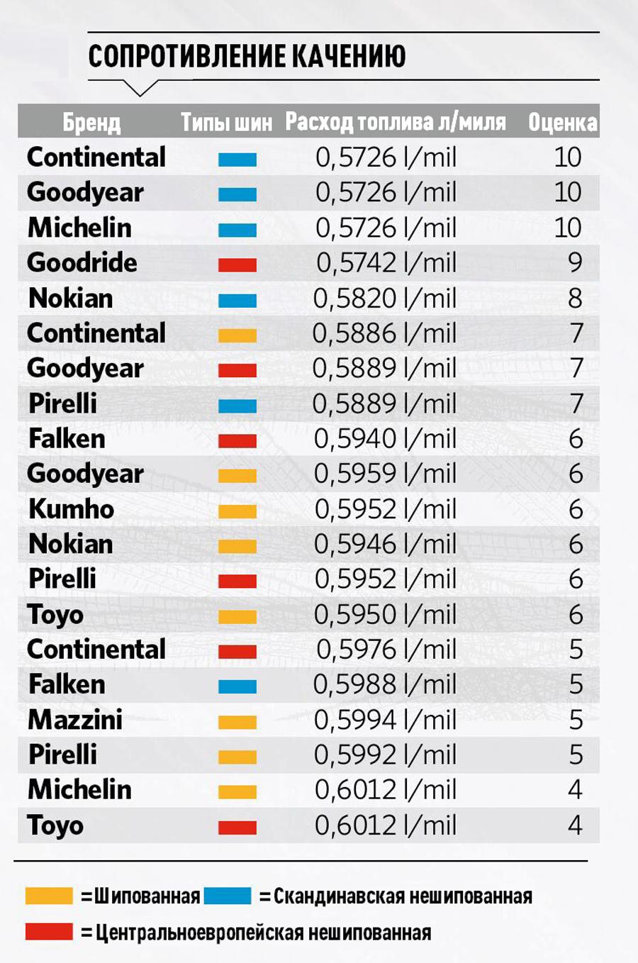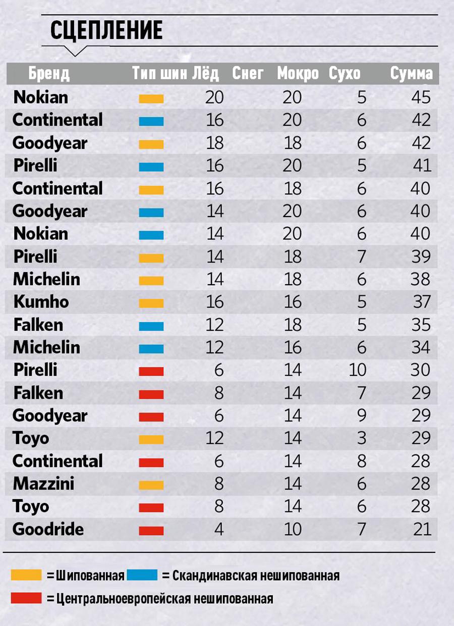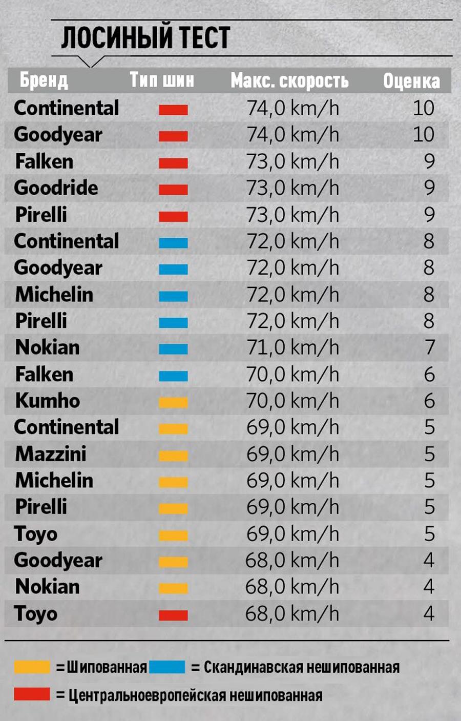 Лучшие шины в целом - центральноевропейские Continental, Goodyear и Pirelli. Все три показывают максимальную скорость около 76 км/ч, что они и должны показывать. Конечно, бывали и лучшие результаты раньше, но это было с другой размерностью. Лучшая шипованная шина - Pirelli Ice Zero 2 с результатом 66,8 км/ч, худшая - Nokian с 57,6 км/ч.