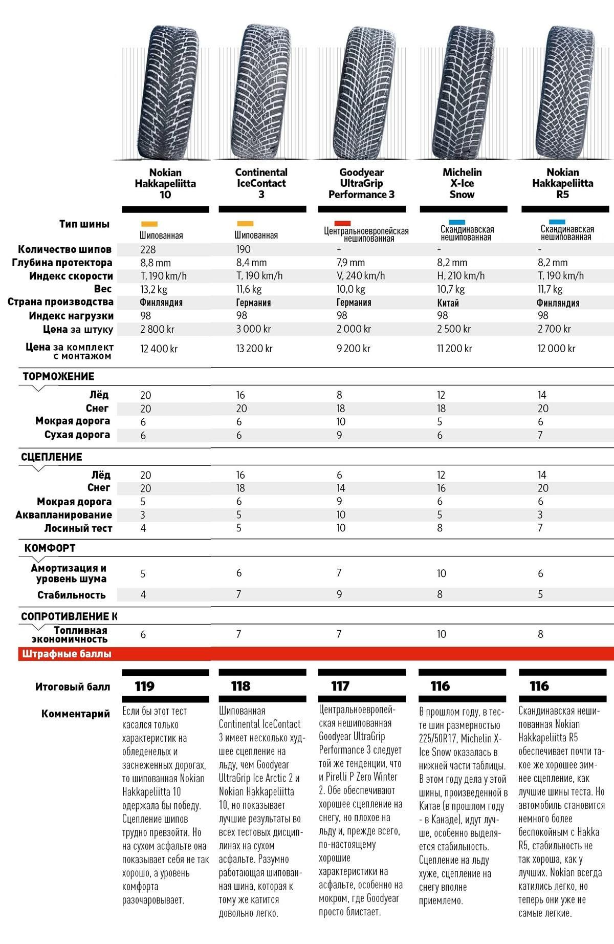 В тестах на торможение на вершине оказались четыре шипованные шины и одна центральноевропейская нешипованная. В особенности впечатляют шипованные Goodyear UltraGrip Ice Arctic 2 и Nokian Hakkapeliitta 10, получившие максимальные баллы (по 20) за эффективность торможения на обледенелых и заснеженных дорогах. Обе шины сочетают это с посредственными характеристиками на мокрых и сухих дорогах - это максимум, на что способны шипованные шины на сухом асфальте. Они просто не лучше.