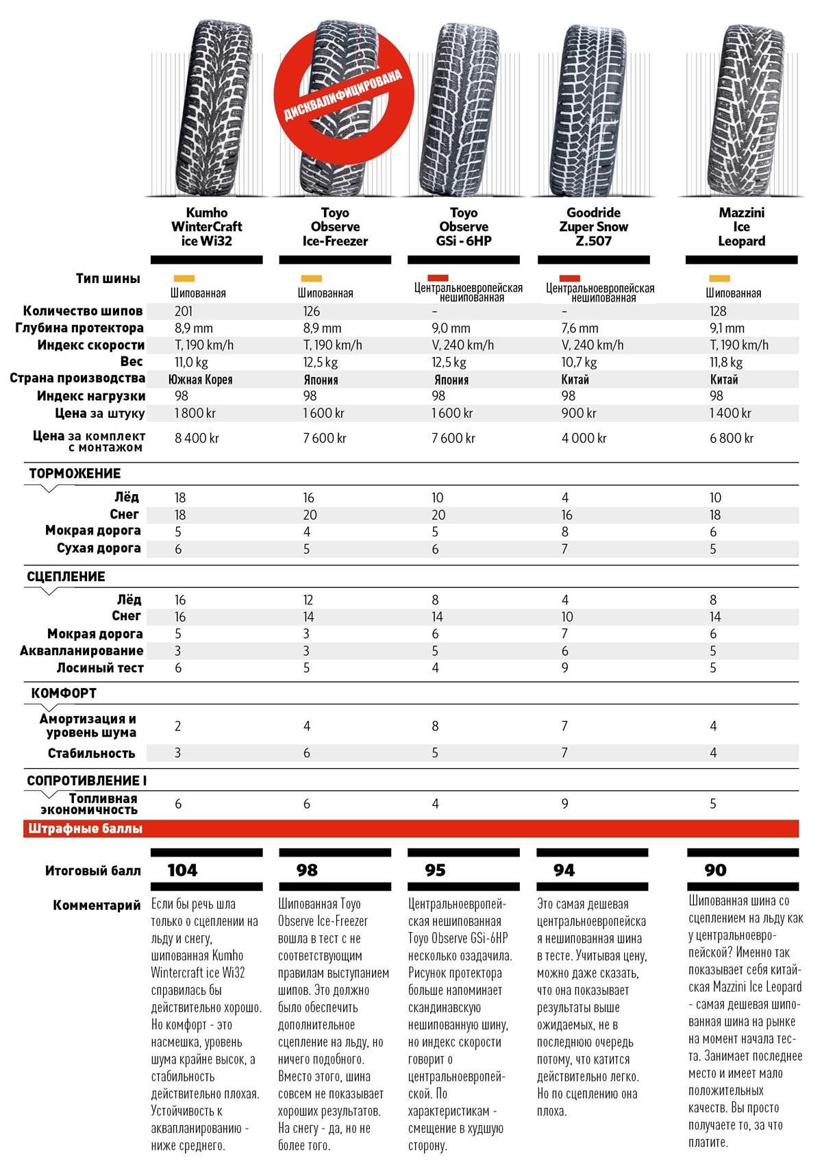 Показатели на льду и снегу оцениваются по шкале от 20 до 0, в то время как характеристики на сухом асфальте оцениваются по десятибалльной шкале. Это сделано потому, что зимним свойствам тестируемых шин придается более высокое значение.