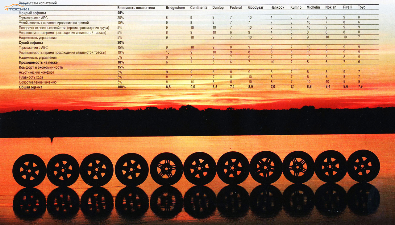 После перевода результатов в баллы, суммируем их с учетом весомости показателей, где асфальтовым тестам отводится 90, а песчаным всего 10 процентов. Максимальное количество баллов набрали шины Continental ContiSportContact 5 SUV, но эксперты отказались признавать их единоличным победителем теста в связи с минимальным отставанием от них моделей Goodyear Eagle F1 Asymmetric SUV и Michelin Latitude Sport. Так что уместнее говорить о тройке лидеров, рекомендованных на мощные скоростные кроссоверы.