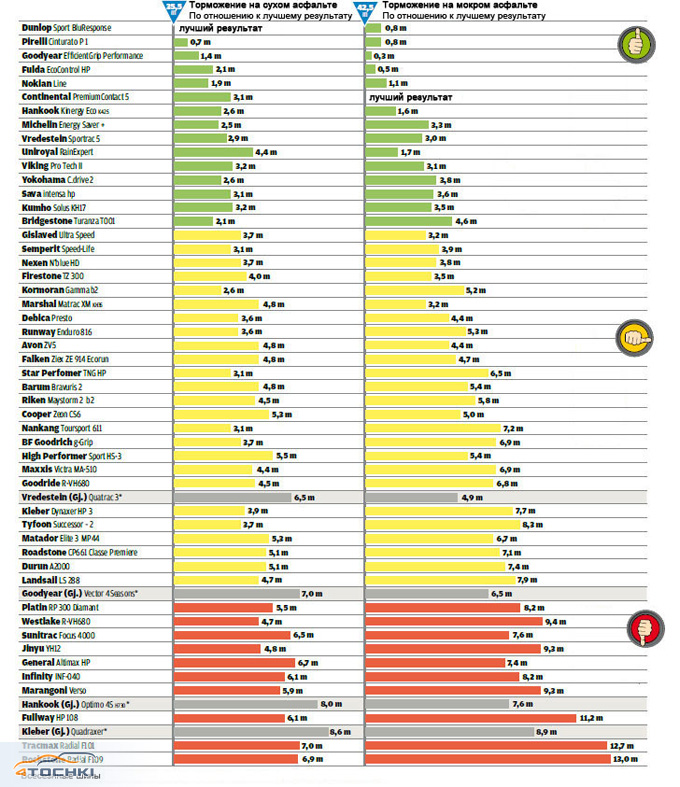 Лучшими в тормозных тестах на сухом асфальте оказались шины Dunlop BluResponse с результатом 35,5 метров. На мокром асфальте лидером стала шина Continental ContiPremiumContact 5 с результатом 42,5 метра.