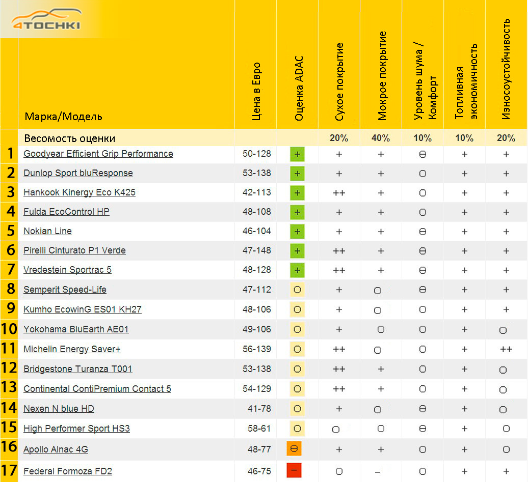 Pirelli Cinturato P1 Verde и Vredestein Sportrac 5, которые также получили оценку ADAC «хорошо». На мокрой дороге не все «хорошисты» продемонстрировали схожие с лидером характеристики. Так тесты на мокрой поверхности