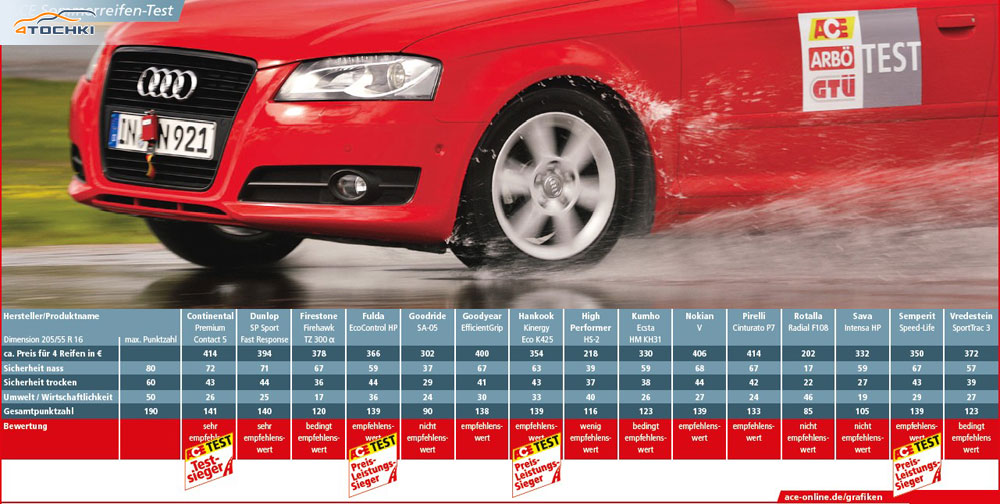 Принятие объективного решения в данной ситуации, как правило, потребует непредвиденных финансовых вложений. Набор летних шин, без учета установки, в популярном размере 205/55 R16 обойдется от 200 до 400 евро. Как видно, разброс довольно большой и здесь на помощь приходит здравый смысл, который подсказывает, что дешево не значит качественно. Это доказывается и в итоговой таблице, где невооруженным взглядом прослеживается зависимость цены и качества протестированных моделей. Так, самая дорогая модель в тесте Continental ContiPremiumContact 5 по праву является лидером нашего испытания, а самая дешевая Rotalla F108 заняла последнее 15-е место.