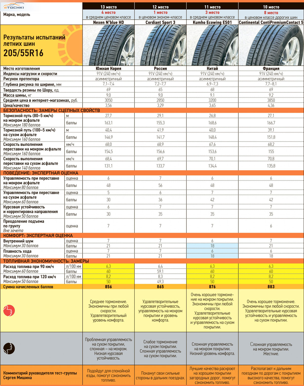 Nordman SX, набравший 905 баллов и тем самым подтвердивший репутацию отличной шины. По сцепным свойствам на сухой и на мокрой дороге оставляет позади скромно тормозящую тройку премиумов, самую малость проигрывает «Хэнкуку», но не уступает ему в поведении на дороге.