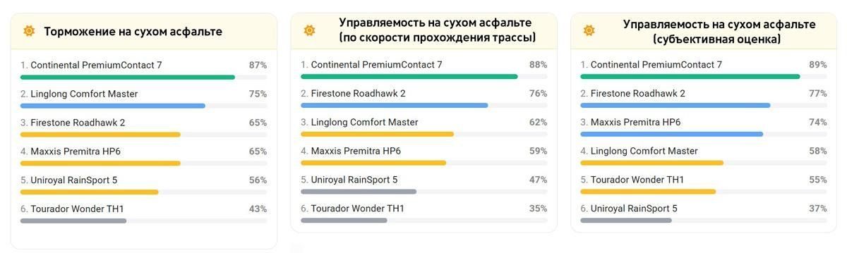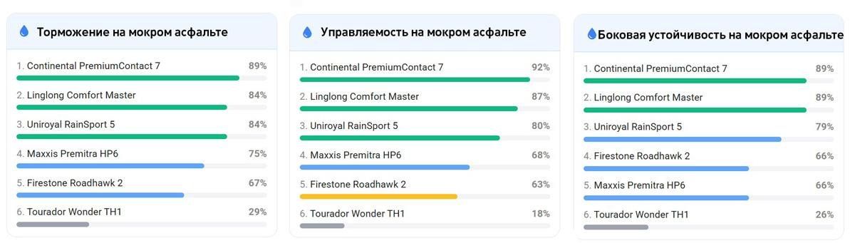 На обеих поверхностях Continental PremiumContact 7 явно превзошла конкурентов. На мокрой трассе Continental остановилась почти на девять метров раньше, чем бюджетная шина от Tourador, при полном торможении со скорости 100 км/ч. Это означает, что когда автомобиль на шинах Continental уже полностью остановился, на шинах Tourador он все еще движется со скоростью почти 40 км/ч.