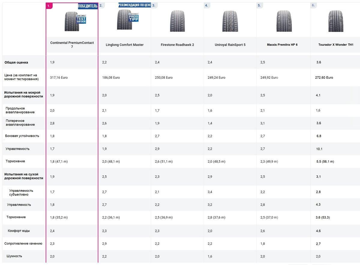 Шина Continental PremiumContact 7 полностью оправдала свой статус фаворита и одержала уверенную победу в тесте. Она предлагает наиболее полный набор спортивных характеристик и максимальной безопасности, но за эти характеристики приходится платить высокую цену. Однако главным сюрпризом теста стало доказательство того, что для хороших характеристик не обязательно тратить целое состояние. Китайская шина Linglong Comfort Master, произведенная в Сербии, обеспечивает первоклассное торможение по доступной цене и заслуженно получает рекомендацию экспертов Netzwelt по соотношению цены и качества - при условии, что вы готовы смириться с повышенным сопротивлением качению.