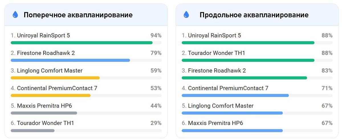 Сначала хорошие новости: почти все протестированные шины обладают хорошим или очень хорошим запасом устойчивости к аквапланированию при наличии стоячей воды на дороге. Для предотвращения аквапланирования рисунок протектора и его глубина должны идеально сочетаться, чтобы мгновенно поглощать и отводить воду.