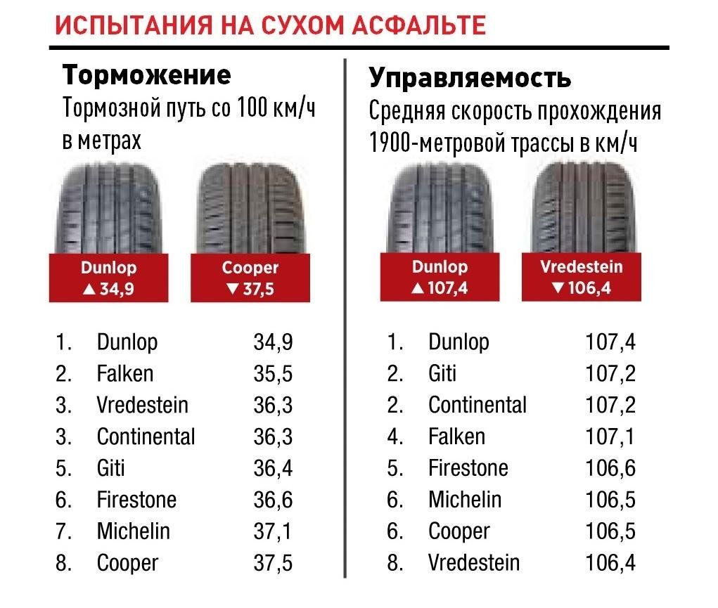 Когда речь заходит о летних шинах, в голову приходят лето, солнце и удовольствие от прохождения поворотов на сухой дороге. В Auto Motor und Sport тоже так думают. Но сначала взглянем на важный с точки зрения безопасности аспект - торможение на сухом покрытии. Действует ли здесь правило: чем меньше сопротивление качению, тем хуже торможение? Совсем нет! Здесь шина с низким сопротивлением качению Falken показывает второй результат - 35,5 метра со скорости 100 км/ч! Респект! Только Dunlop из того же концерна тормозит на 0,6 м лучше. В пределах 37 метров остаются Vredestein, Continental, Giti и Firestone. Michelin чуть превышает этот порог, Cooper - немного больше.