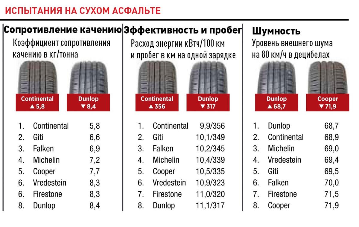 А как остальные участницы? Самая экономичная среди «обычных» - не самая дешёвая Michelin Primacy 5: с ней резерв аккумулятора в этом тесте загорается уже после 339 км, то есть на 17 км раньше, чем с Continental. Если же на тестовом электромобиле установлены самые «тяжёлые» по качению новые шины Dunlop, лампа резерва загорится уже после 317 км - на 39 км раньше, чем с шинами Continental. Это разница в расходе более 10 процентов: у электромобилей она проявляется в разнице запаса хода, а у малолитражек с ДВС - примерно в пол-литра лишнего расхода топлива на 100 км в городском цикле.