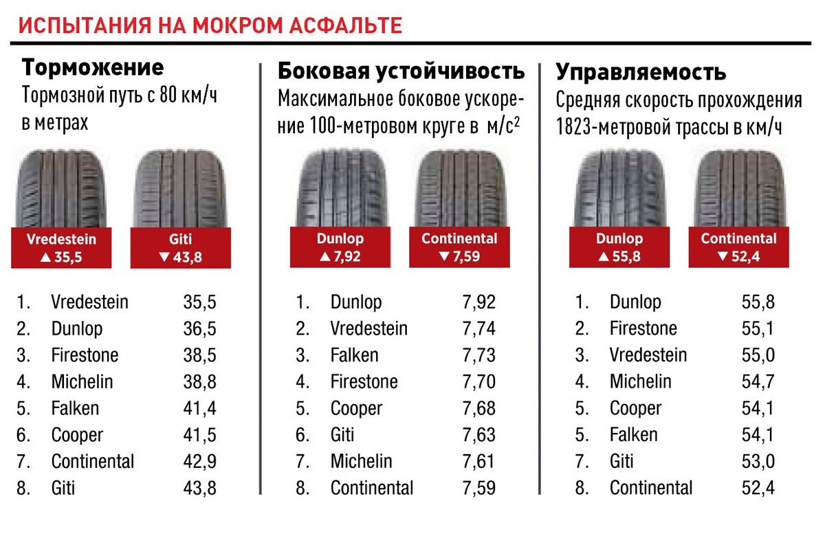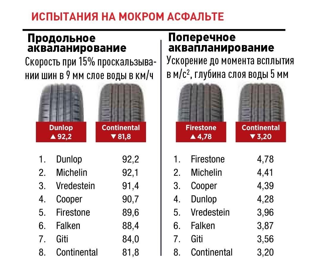 В других дисциплинах на мокром покрытии также выделяется тройка Dunlop, Vredestein и Firestone - у них лучшее сцепление и, соответственно, оптимальная безопасность. А что насчёт аквапланирования? Здесь экономичные шины не выигрывают: те, кто легче катится, очевидно, раньше начинают «плыть».
