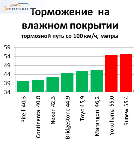 Каждый сантиметр имеет значение. Marangoni показало наилучший результат. Sunew потребовалось 39, 6 метров, чтобы остановить автомобиль, что ниже среднего значения.