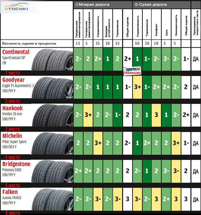Continental ContiSportContact 5P, Bridgestone Potenza S001 и Michelin Pilot Super Sport, но и стоящие на ступень ниже шины Hankook и Falken. Несмотря на такое позиционирование два последних производителя не являются новичками в производстве спортивных шин. Например, компания Hankook является эксклюзивным поставщиком резины для гоночных болидов DTM, что говорит о высоком уровне производимой продукции. Falken также успешно участвует в гонках на выносливость, а ее модель Azenis FK453 вообще оказалась впервые в нашем тесте, а потому вдвойне интересна.