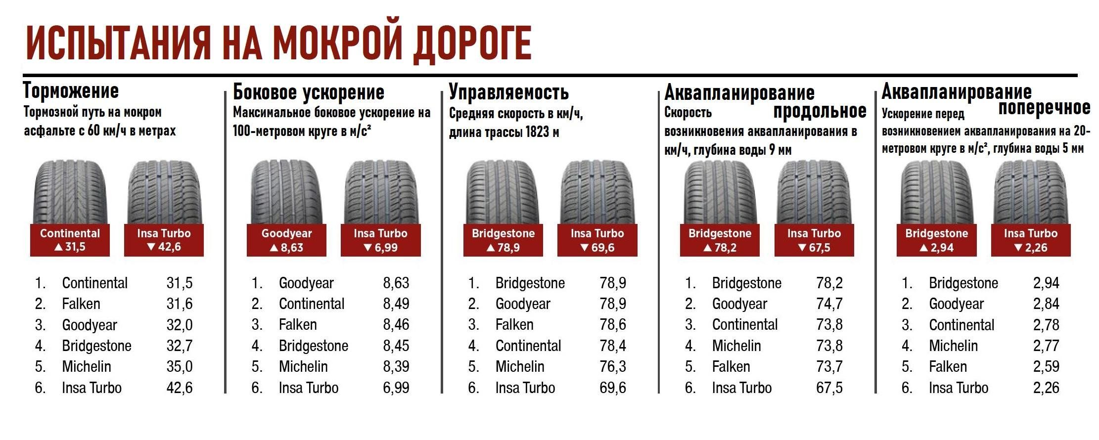 Сравнение средних показателей торможения на мокрой дороге с 80 км/ч до полной остановки показывает, что три лидера - Continental, Falken и Goodyear - разделяют менее полуметра. Bridgestone уступает лидирующей Continental 1,2 метра. Michelin, оптимизированная для минимального сопротивления качению и износа, проигрывает 3,5 метра.