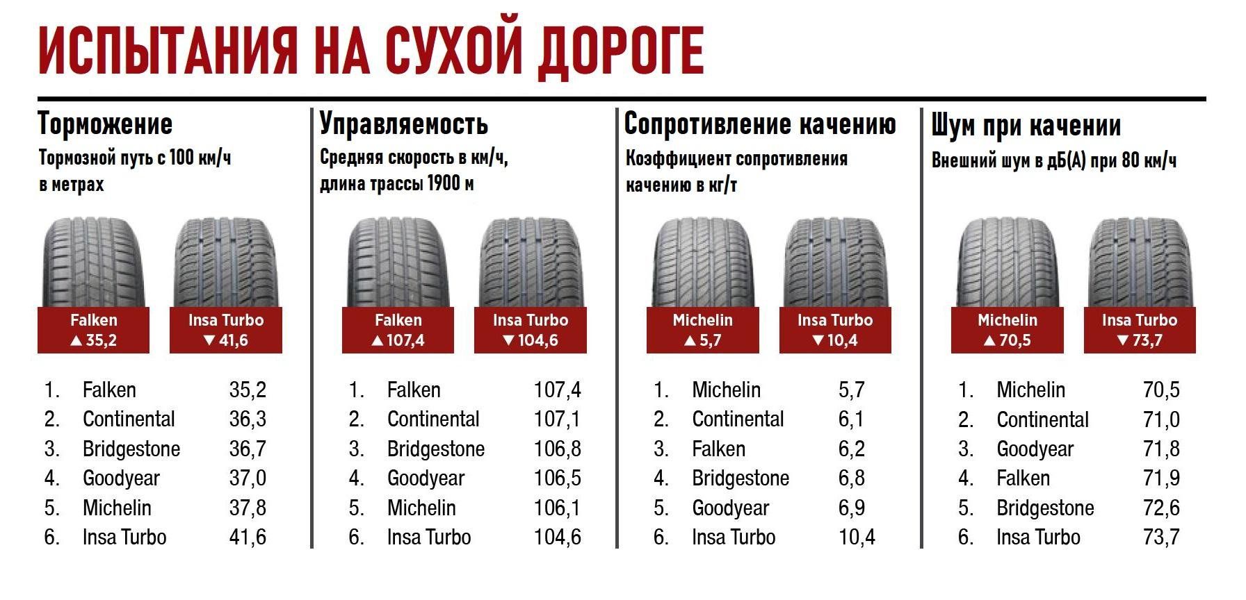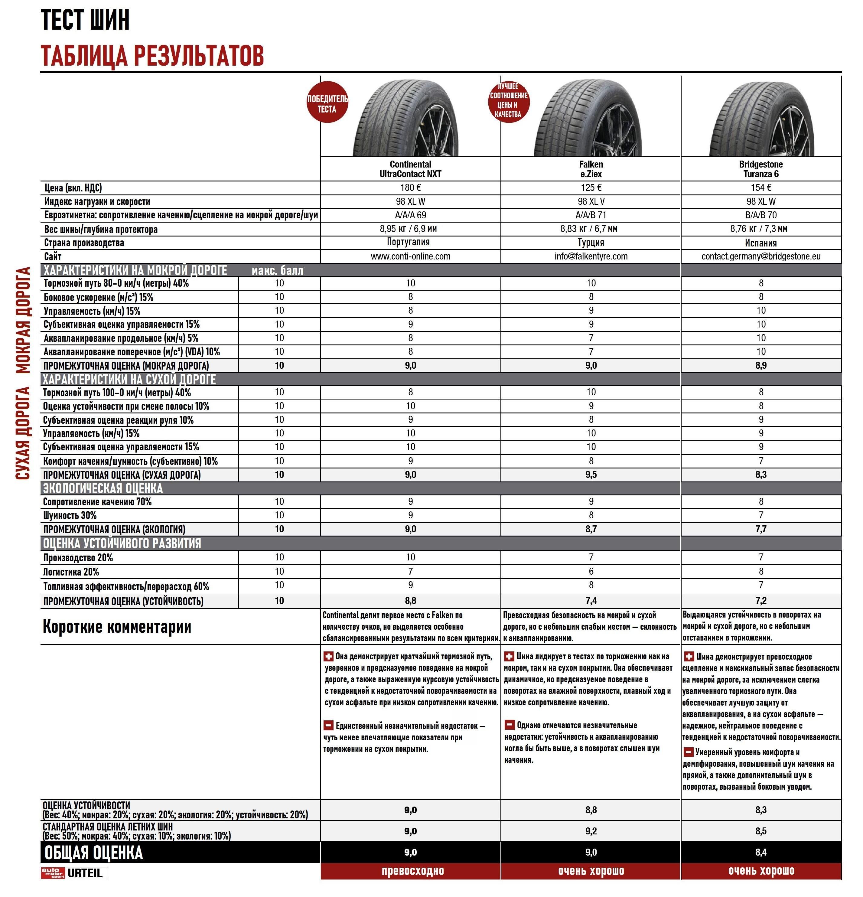 Несмотря на небольшое отставание в мокром торможении, Goodyear с ее превосходным сцеплением в поворотах, устойчивостью к аквапланированию и точностью управления на мокрой дороге немного опережает Bridgestone. На сухом покрытии Continental и Falken демонстрируют наилучшие характеристики. Michelin выделяется исключительным комфортом, низким уровнем шума и экономичностью, а также предсказуемым поведением в экстремальных ситуациях. Для электромобилей она становится оптимальным выбором благодаря максимальному запасу хода и тихой работе.