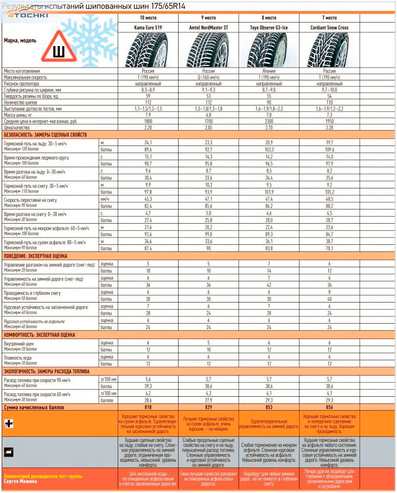 Гиславед-Норд Фрост 100» и японский «Бриджстоун-Близзак Спайк 01» – по 2700 рублей за покрышку. Какую из них выбрать? Чтобы ответить, придется изучить таблицу с результатами. По результатам замеров эти покрышки сопоставимы, разница лишь в субъективной оценке экспертов. Однако «Гиславед» получил 884 балла и четвертое место, а «Бриджстоун» – 859 баллов и лишь шестую строчку рейтинга.