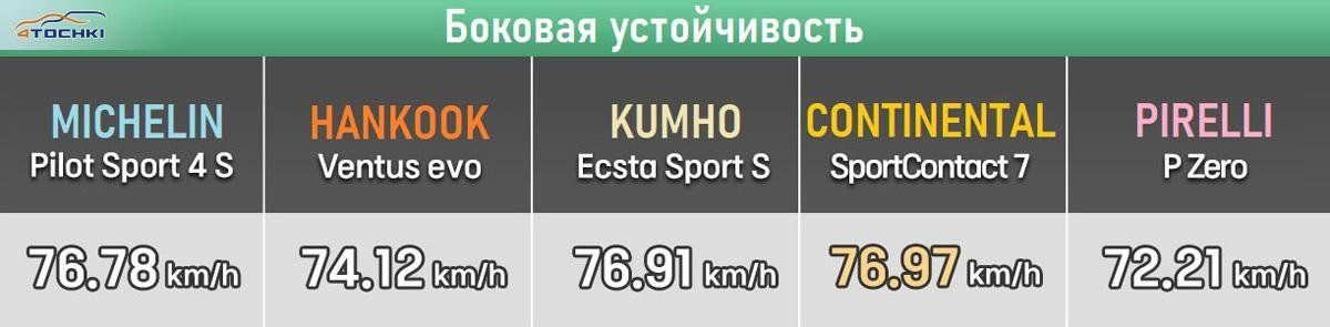 Hankook Ventus evo, напротив, показала более низкую скорость - 74,1 км/ч. Хотя пока рано делать выводы, но принимая во внимание устойчивость в поворотах, Ventus evo, вероятно, относится к шинам среднего ценового диапазона. Другими словами, она, скорее всего, будет конкурировать с такими шинами, как Continental MC7 и Michelin PS5, а не с SC7, PS4S и 72S, с которыми она соревнуется в этом тесте.