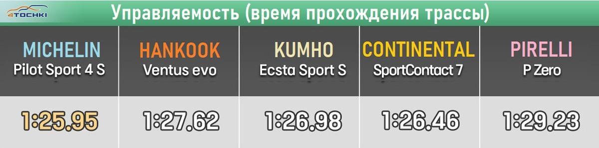 Пятое место, как все и ожидали, досталось Pirelli P Zero. Её время составило 1 минуту 29,23 секунды. Несмотря на разницу в температуре окружающей среды, Continental MC7, которая классом ниже, показала результат 1 минуту 27 секунд, а PS5 - 1 минуту 28 секунд, так что результаты сопоставимы.