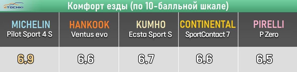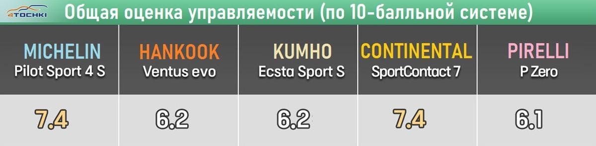 Pirelli P Zero: Реакция на повороты руля лучше, чем у шин Kumho и Hankook. Несмотря на то, что этим шинам не хватает линейности по сравнению с шинами Michelin и Continental, для премиального класса они обеспечивают отличную управляемость. Однако при смещении нагрузки на одну из осей может возникнуть некоторая нестабильность. Последующий толчок аналогичен таковому у шин Hankook. Значительный резонансный шум по сравнению с другими шинами усугубляет разочарование. В целом, шины превосходят Kumho и Hankook по управляемости, но уровень сцепления слишком низкий.