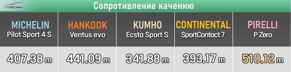 С другой стороны, самое короткое расстояние было зафиксировано у Kumho 72S. Шины Continental SC7 также продемонстрировали значительное сопротивление качению. Hankook evo продемонстрировали относительно хороший уровень сопротивления качению. Отметим, что и другие шины, которые эксперты AutoView тестировали недавно, в основном демонстрировали приемлемые показатели сопротивления качению.