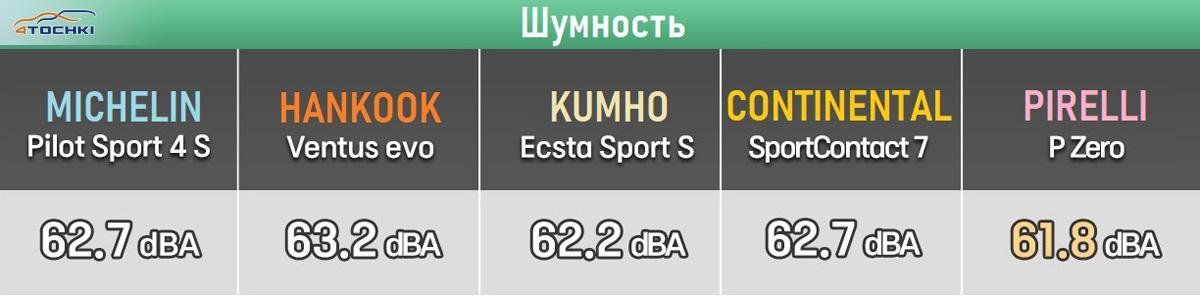 В объективном тесте лучшими оказались шины Pirelli, за ними следовала Kumho. Это означало более низкий уровень шума. В субъективном тесте, Michelin и Hankook показали себя на одинаково высоком уровне, за ними следовали Kumho, Continental и Pirelli. Как уже упоминалось в общем тесте на управляемость, шумовой резонанс шин Pirelli был более выраженным, что снизило уровень удовлетворенности. Шины Continental в целом были приемлемыми, но уровень их шума казался немного завышенным.