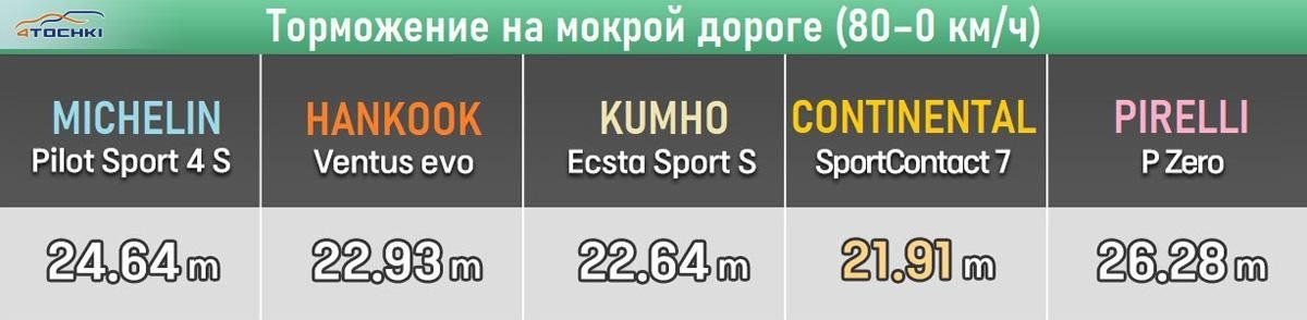 Эффективность торможения на мокрой дороге оценивалась путём измерения тормозного пути с 80 км/ч до полной остановки. Наилучший результат показали шины Continental SC7 со средним тормозным путем 21,9 метра. Далее следуют шины Kumho с 22,6 метра и шины Hankook, показавшие хороший результат 22,9 метра. Напротив, шины Michelin PS4S, которые до этого показывали хорошие результаты, выступили неубедительно - 24,6 метра. Как уже упоминалось, OE-шины BMW обладают ограниченными характеристиками производительности на мокрой дороге. В то время как Mercedes-Benz, Volkswagen и другие автопроизводители отдают приоритет характеристикам на мокрой дороге. Южнокорейские Hyundai и Kia не проводят испытания на мокрой дороге. Renault же, по имеющимся данным, проводит очень жесткие тесты.