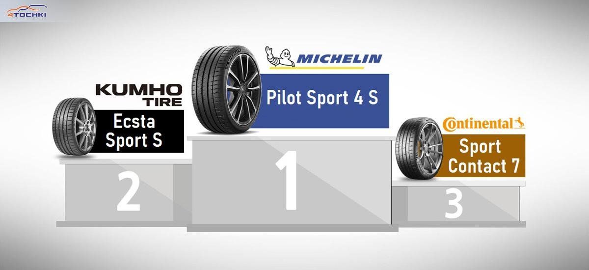 Шины Michelin PS4S, разработанные для BMW M3, получили наивысший балл и заняли первое место. Тестировщикам понравились их превосходный баланс, идеальная управляемость и сцепление с дорогой. Второе место заняла Continental SC7, которая является представителем шин вторичной комплектации, но на вторичном рынке редко можно найти шины с такими высокими характеристиками.