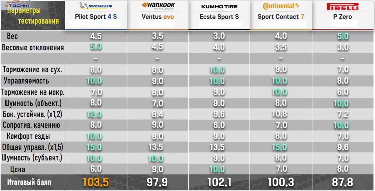 Тест проводился, начиная с контрольной (эталонной) шины Michelin, за которой следовали новые модели Hankook, Kumho, Continental и Pirelli.