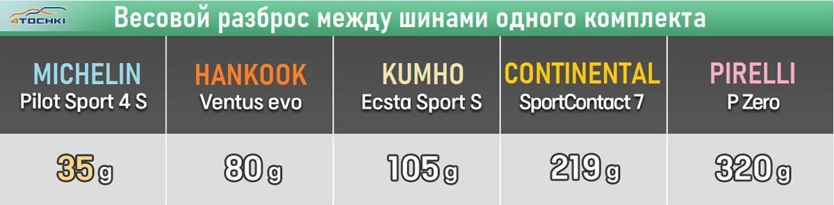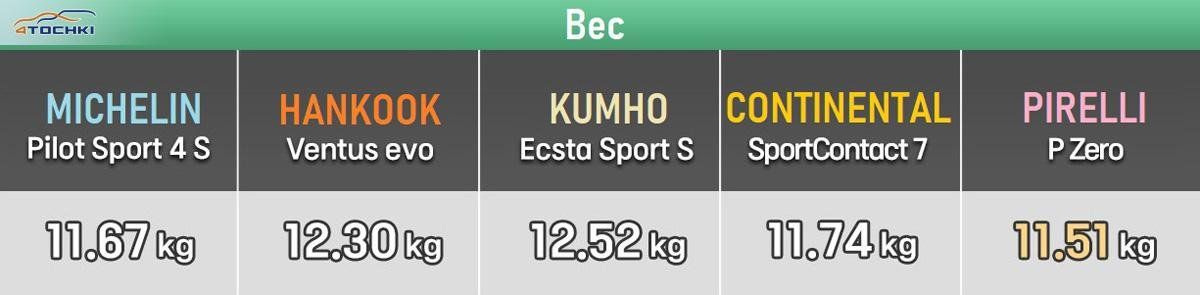 Наименьшее отклонение по весу было у шин Michelin, разница между самой тяжелой и самой легкой шинами составила около 35 г. Далее следовали Hankook с отклонением 80 г и Kumho с отклонением 105 г. С другой стороны, у Continental и Pirelli отклонения были значительно больше.