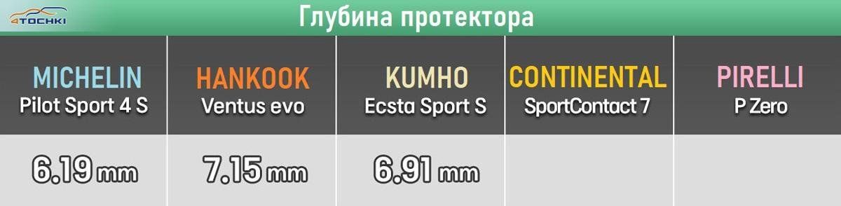 Хотя канавка протектора не является оценочным элементом, но её, в некоторой степени, можно использовать для оценки долговечности. По этой причине журналисты южнокорейского интернет-портала просят вашего понимания, что не могут предоставить информацию о шинах Continental SC7 и Pirelli P Zero, а раскроют информацию только о трех оставшихся шинах.