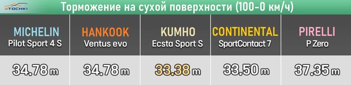 Что касается эффективности торможения на сухой дороге со скорости 100 км/ч до полной остановки, то лучшие результаты продемонстрировали Kumho и Continental.