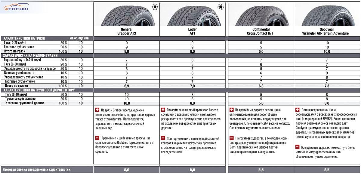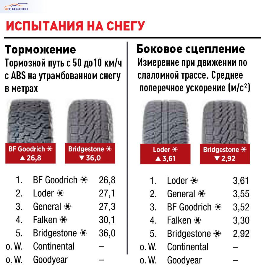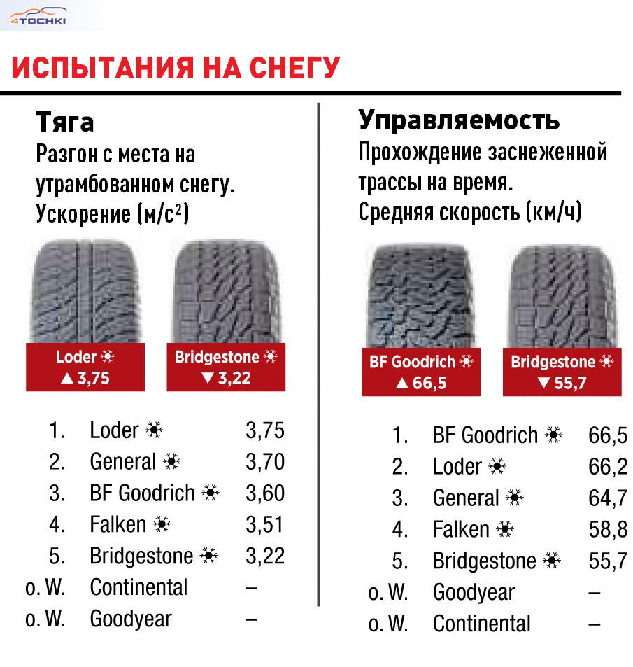 Превосходную зимнюю производительность в этом тесте демонстрирует Loder AT1, которая в дисциплинах на снегу располагается даже перед цепкой BFGoodrich All-Terrain T/A KO2 и показывающей схожий зимний результат General. С приличной тягой и достойным торможением Falken также является хорошим выбором, если не учитывать его слабую динамику на снегу. А вот Bridgestone Dueler All-Terrain A/T002 можно рекомендовать только при очень редких контактах со снегом.