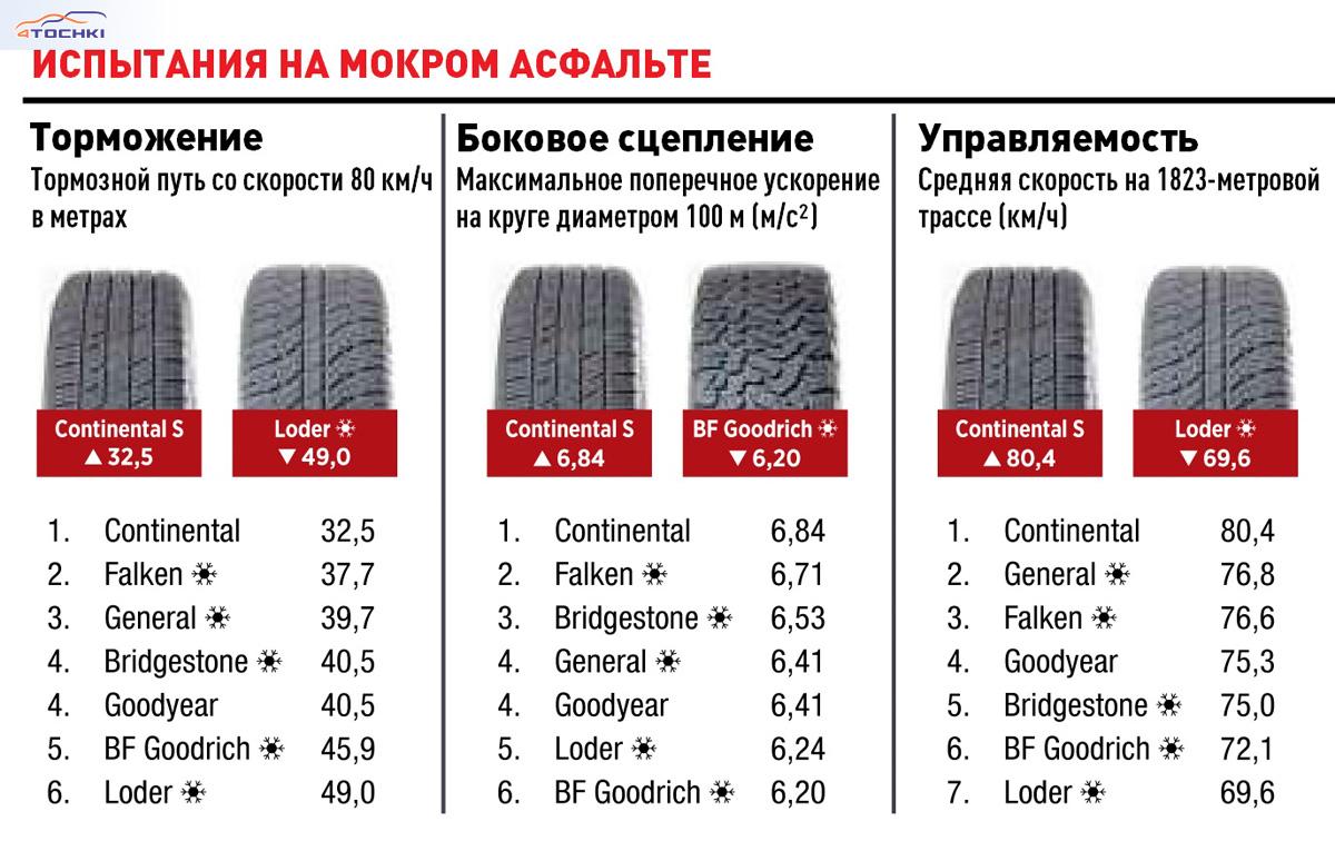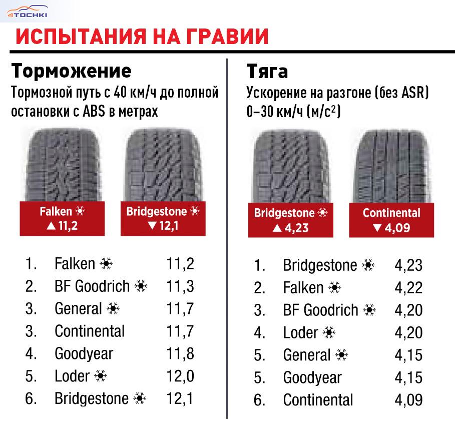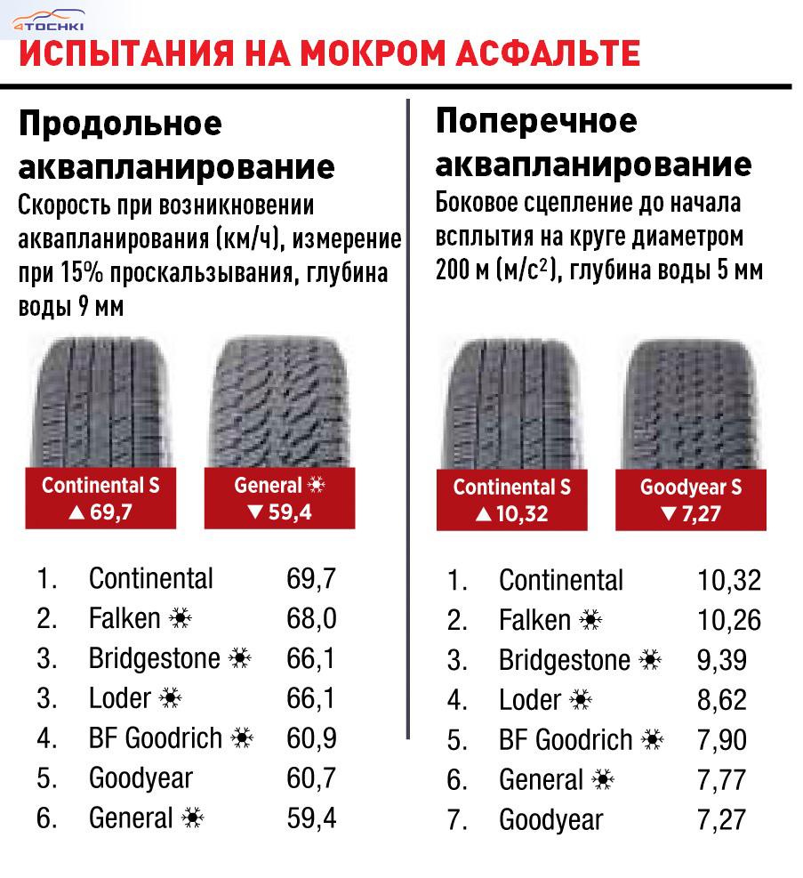 При тех же условиях Bridgestone и Falken завершают испытания с оценкой «хорошо», а General и Goodyear достигают, по крайней мере, удовлетворительного результата.