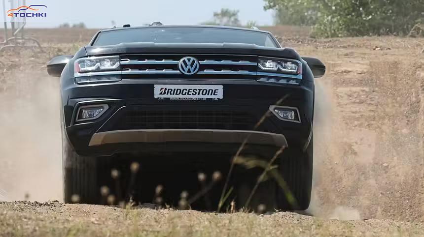 Чтобы зафиксировать различия в сцеплении, тестировщики замеряют время прохождения круга на извилистой гравийной трассе и фиксируют свои субъективные впечатления от вождения. Это испытание, естественно, проводили не на жестком пикапе Toyota Hilux, а на кроссовере VW Atlas - американской версии Tiguan, на который такие крупные шины подходят без проблем.